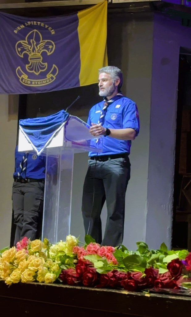 Σύντομο χαιρετισμό, απηύθυνε και η ταμίας της Επιτροπής Κοινωνικής Συμπαράστασης (ΕΚΣ) του συστήματος, κα. Καλλιόπη Ταξειδαράκη, η οποία προέτρεψε να αναλογιστούμε την προτροπή του ιδρυτή λόρδου Baden Powell, «αφήστε τον κόσμο λίγο καλύτερο απ’ ότι τον βρήκατε».
