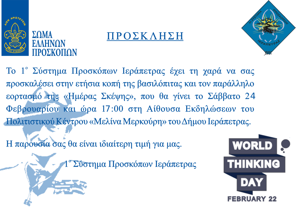 Το Σάββατο 24 Φεβρουαρίου 2024 σε μια όμορφη εκδήλωση στο Πολιτιστικό Κέντρο «Μελίνα Μερκούρη» του Δήμου Ιεράπετρας, πραγματοποιήθηκε η καθιερωμένη κοπή της βασιλόπιτας του 1ου Συστήματος Προσκόπων Ιεράπετρας και παράλληλα εορτάστηκε η Παγκόσμια Ημέρα Προσκόπου «Ημέρα Σκέψης» όπου οι πρόσκοποι όλου του κόσμου κάθε χρόνο την 22α Φεβρουαρίου γιορτάζουν τη μνήμη των γενεθλίων του ιδρυτή του Προσκοπισμού και είναι αφιερωμένη στην παγκόσμια φιλία, ειρήνη και συναδέλφωση των λαών της γης.